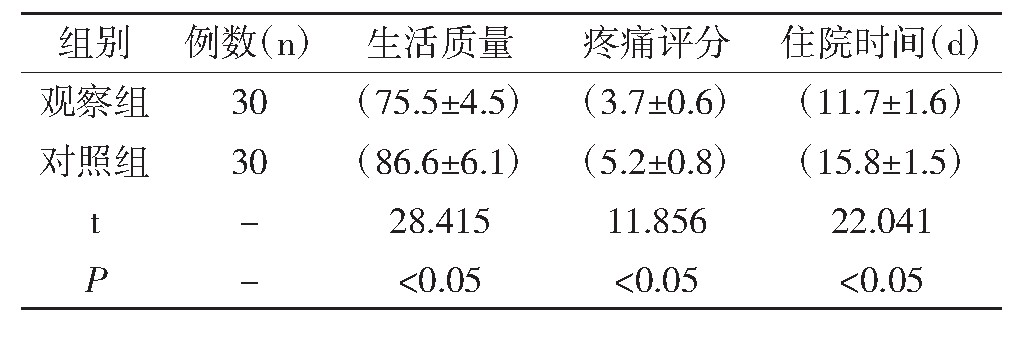 觀察組患者生活質量較高,疼痛評分較低,住院時間較短。見表2