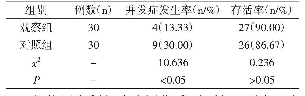 觀察組患者術后并發癥發生率較低,存活率兩組相近。見表1