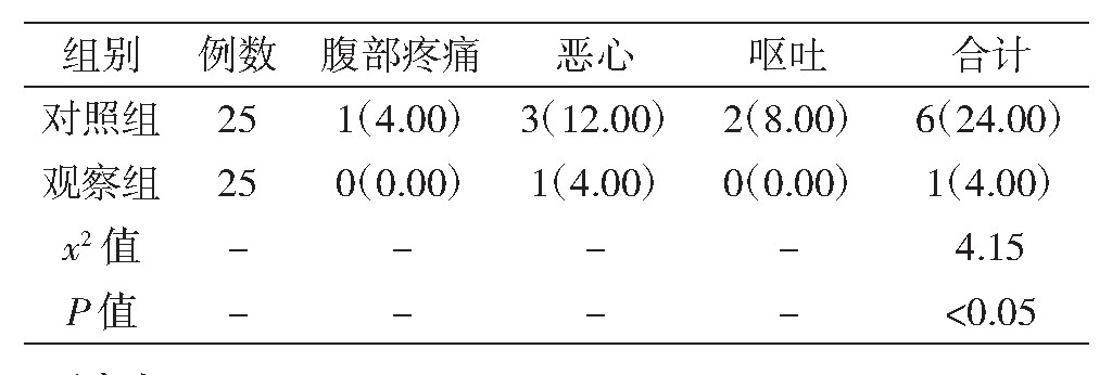 觀察組的不良反應率明顯低于對照組,且P<0.05。見表2