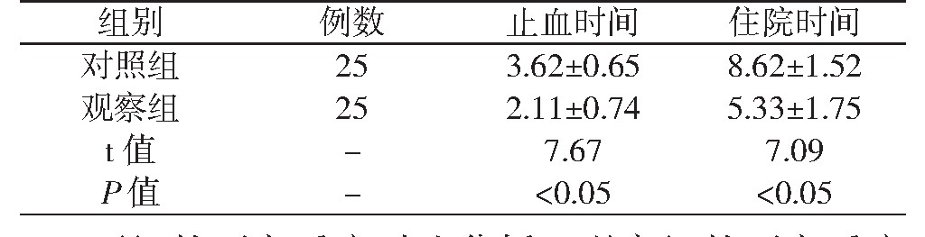 觀察組的止血時間、住院時間比對照組短,且P<0.05。見表1
